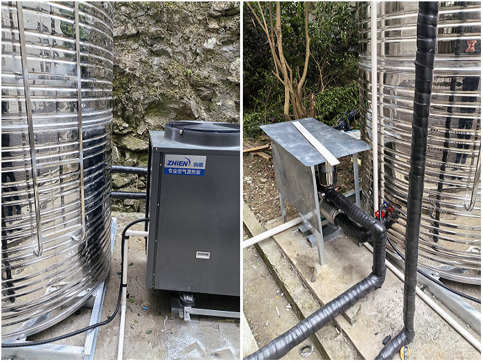 湖北黃岡一中學熱水熱水系統采用了智恩10匹空氣能熱泵熱水機( ZN-KFDX-100ll)+10噸圓形不銹鋼保溫水箱。